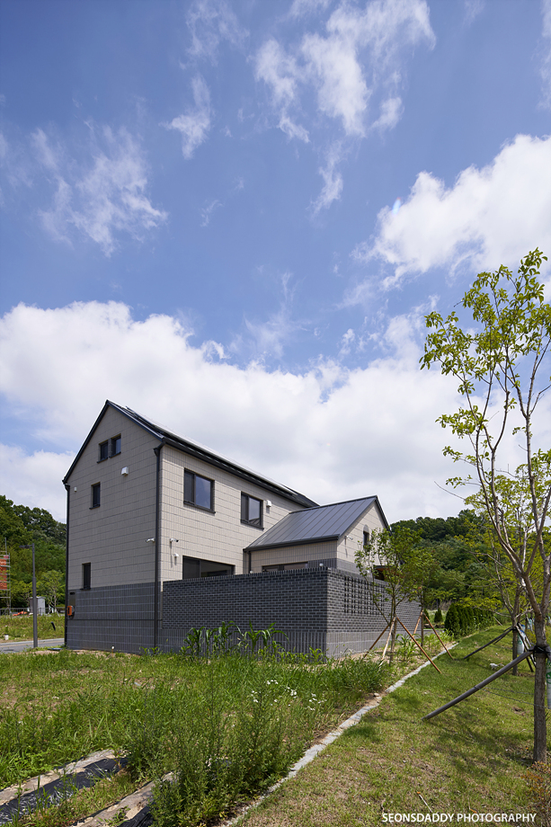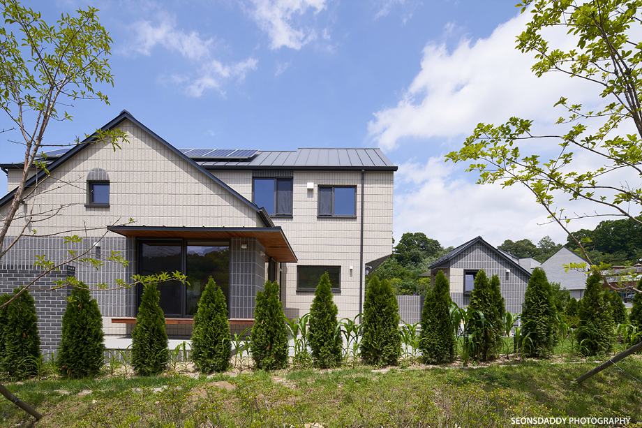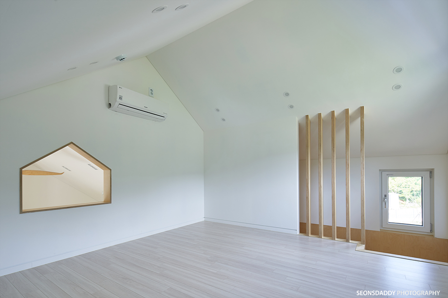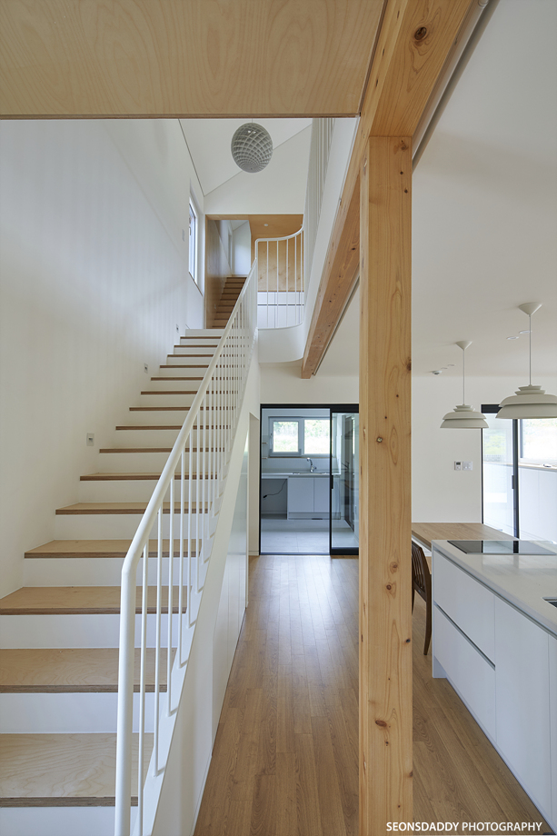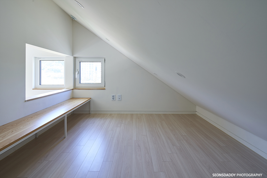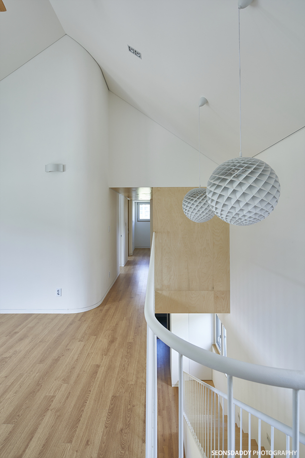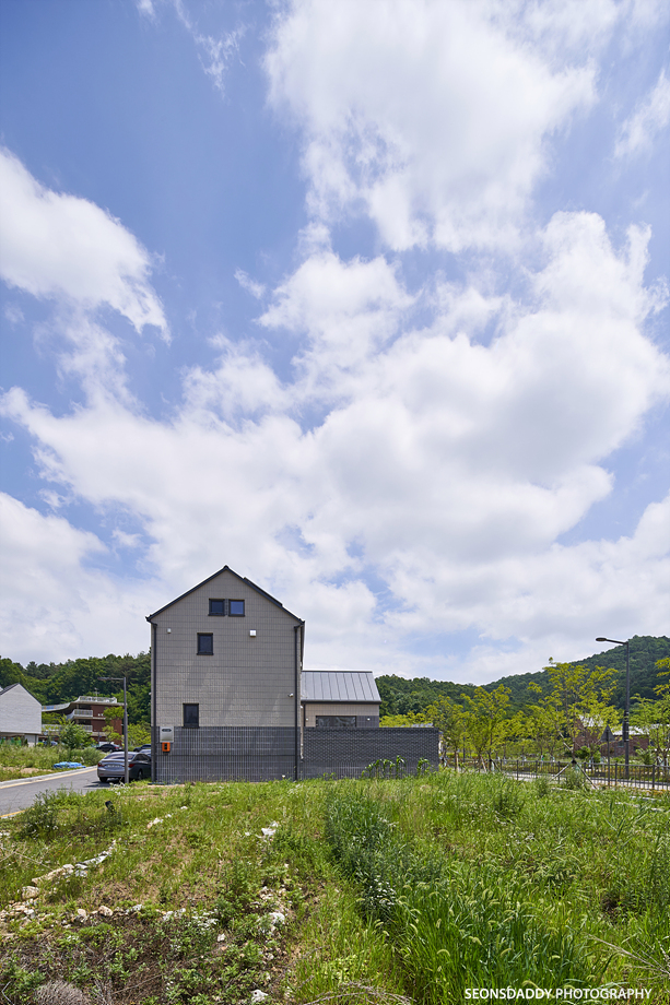 세로타입으로 적용한 외장마감은 주택을 보다 규모있고 스타일리시한 느낌으로 더해 줍니다. 라운드처리된 키 낮은 담장과 대문은 이 집의 첫인상에 아늑함을 더하며, 내부에 노출된 중목은 정체성과 더불어 따뜻함을 공간에 드리우는 듯 합니다. 나무의 따스함에 화이트의 깔끔한 느낌이 어우러지는 이 집은 다양한 수납공간이 주는 생활의 편리성과 더불어 두 개의 다락방을 통한 프라이빗한 공간 활용이 기대되기도 합니다.