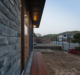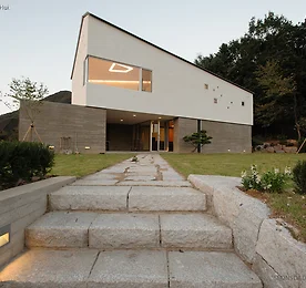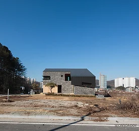 전원주택, 고양 성석동주택 경기도 고양시 성석동에 자리한 단독주택. 도로에 접한면이 10m 정도고 뒤로 길게 늘어선 대지의 모양에 따라 건물 역시 같은 방향으로 길게 자리했습니다. 전면부의 디자인은 아산주택과 흡사한 형태를 띄고 있으며 후면으로의 확장을 통해 공간을 여유있게 구성함과 동시에 마당을 효율적으로 활용할 수 있도록 계획한 것이 특징입니다. 토지매입 당시 주차박스 및 대지로 오르는 조경석 계단이 이미 설치되어 있는 상태였으나 건축주 요구로 계단은 심플하면서도 오르내리기 편한 구조로 다시 설치되었습니다. 마감재는 화산석이 적용되었습니다. 주택의 주요 마감은 스타코와 고벽돌이 주를 이루는 가운데 화산석과 중목 PSL노출 등의 요소로 재미가 가미되었습니다. 지붕은 리얼징크로 마감되었으며 마감재의 톤이 주는 무게감의 경중이 주택.. 더보기