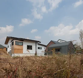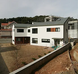 김포한강신도시 듀플렉스하우스 자매의 가족, 두 세대가 함께할 듀플렉스 하우스 계획안입니다.김포 한강신도시에 위치할 본 주택은 비슷한듯 다른 취향을 담은 집입니다.주택의 배치는 두 세대의 균등한 공간 분배 및 환경에 많은 신경을 썼습니다.가로에서의 접근성 및 공간송을 확보해야 했으며, 각 세대의 독립적 형태구현 또한 중요했습니다.마당은 총 3개로 구성되며 현관쪽의 진입마당, 그리고 남측 안마당과 이어지는 넓은 마당이 그것입니다. 동생 세대가 거주할 좌측 주택은 아토피가 있는 아이들을 위해2층과 다락층에 넓은 테라스를 배치, 풍욕을 즐길 수 있도록 했으며 반신욕기를 마련했습니다.컴퓨터 게임을 좋아하는 아이들을 위해 집 안 어느 곳에서나 편리한 인터넷 사용이 가능토록 통신계획을 세웠으며,독서 또한 소홀히 하지 않게 하기 위해 곳곳에 수납.. 더보기