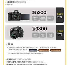 니콘 D5300, D3300 서포터즈 모집! 니콘 D5300, D3300 서포터즈 모집!http://www.nikon-image.co.kr/event_view.do?idx=220 더보기